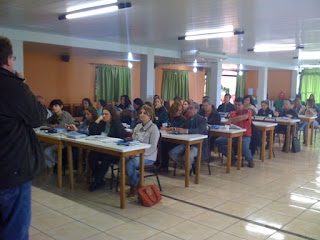 A Profa. Dra. Elisa (UDESC) falou sobre a novas formas do professor trabalhar com os alunos na sala de aula. Sobre os diversos tipos de projetos pedagógicos (de Aprendizagem e de Ensino). Os participantes aproveitaram essa temática para relatar sobre suas experiências profissionais.